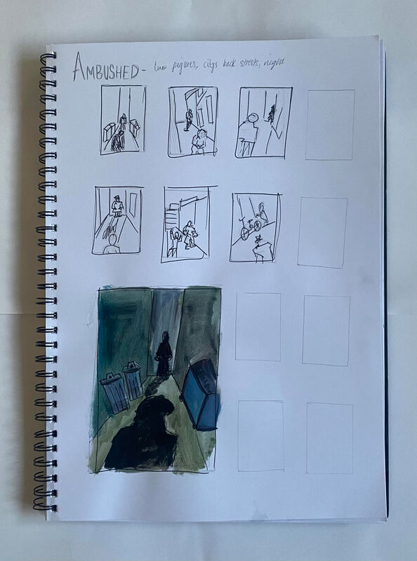 I decided to produce the final piece digitally, using different brushed and opacities to get a sense of depth to the forest scene. I really like the ominous sense you get from the yellow mist creeping forwards. When creating the final piece, I felt the path was too empty and wanted to add a street lantern as another form of lighting the piece. Ideally I would have created some new thumbnails with this aspect incorporated into them, to figure out where was the ideal placement. Instead of this I went straight in and placed the lantern near the figure. I don't think this placement looks awful, but now the left side feels a bit heavier than the rest of the piece. In future I now know to only add extra elements to a final piece after experimenting with thumbnails. I shouldn't be asking myself questions about placements or layouts while creating a final piece, these should all have been figured out during the thumbnailing stage.
