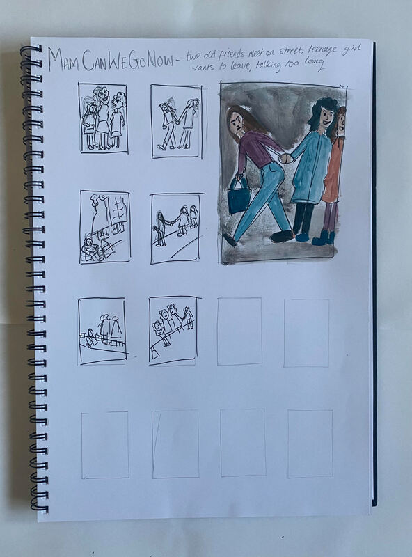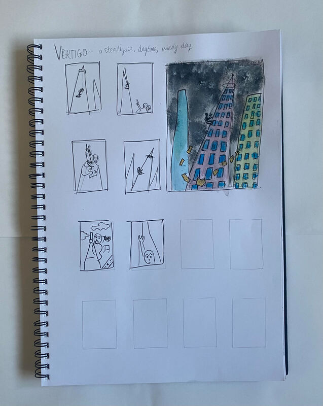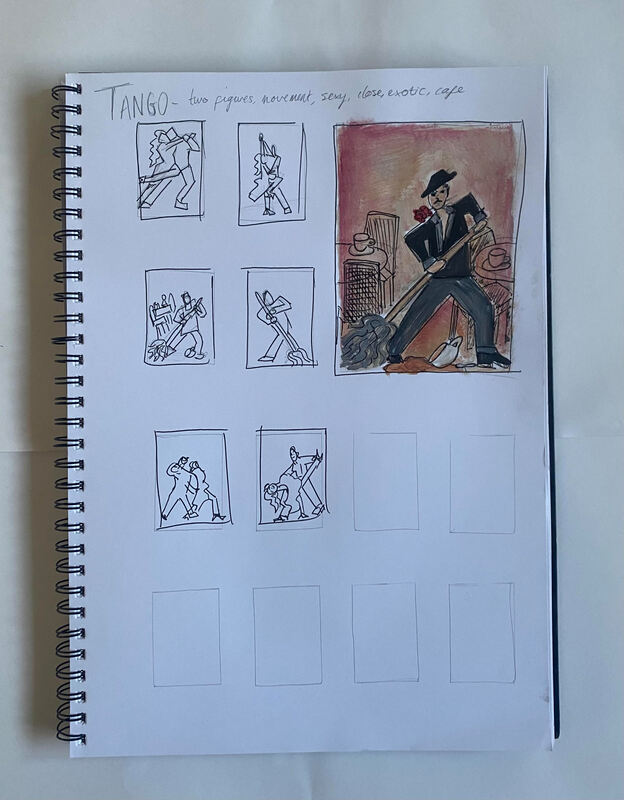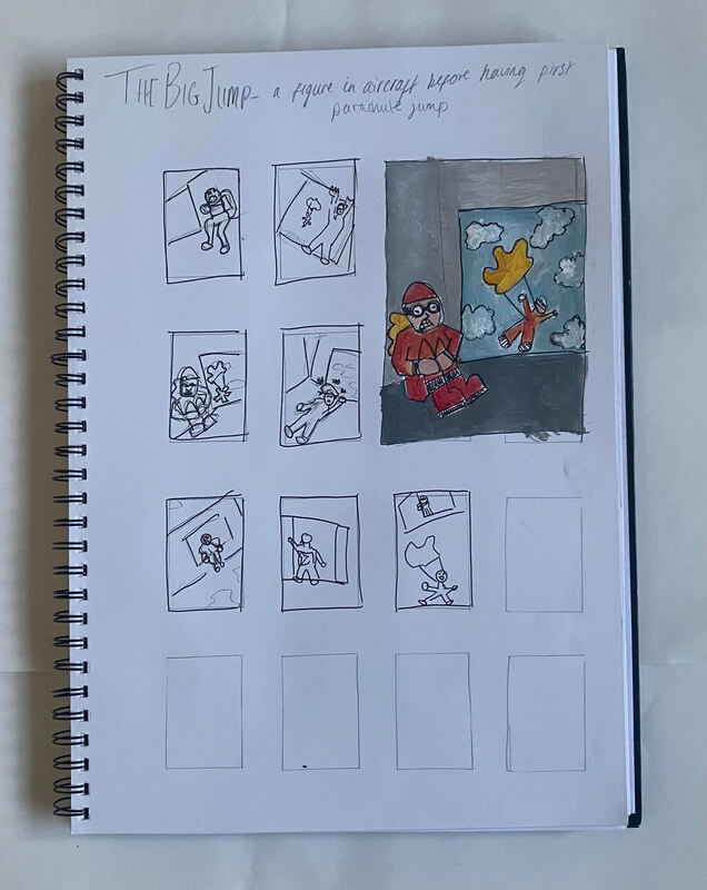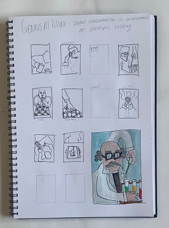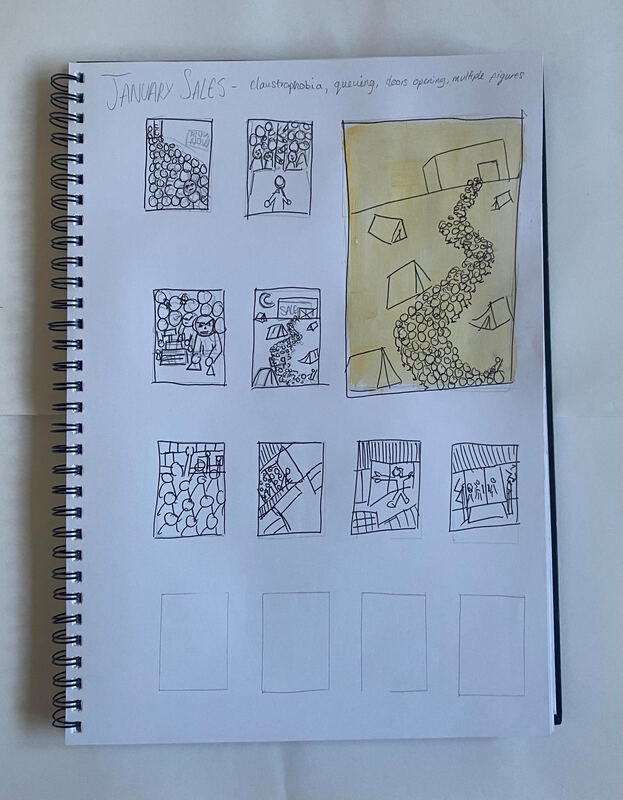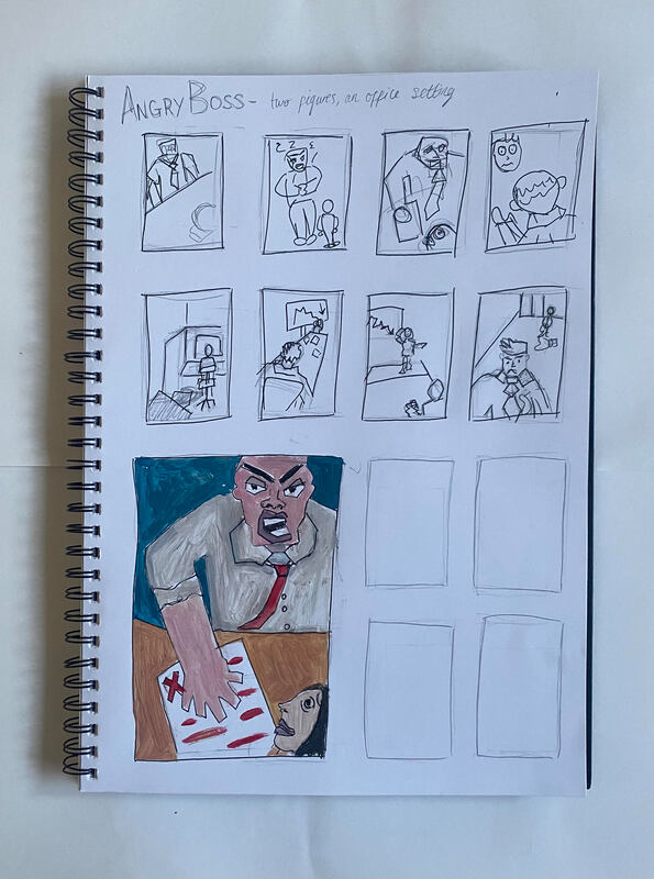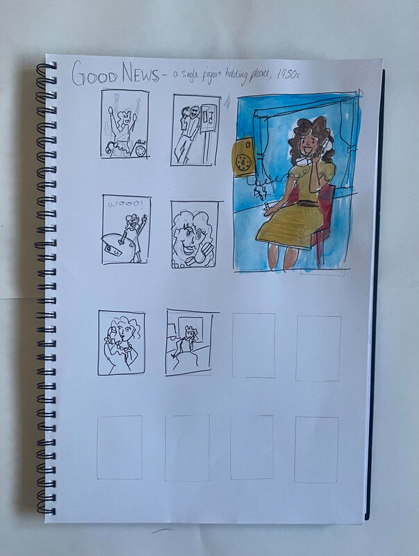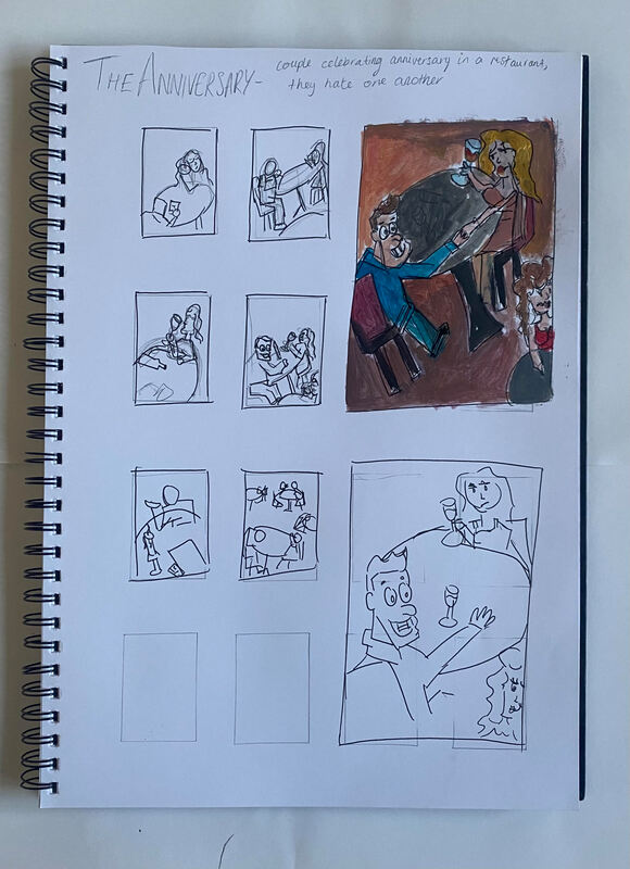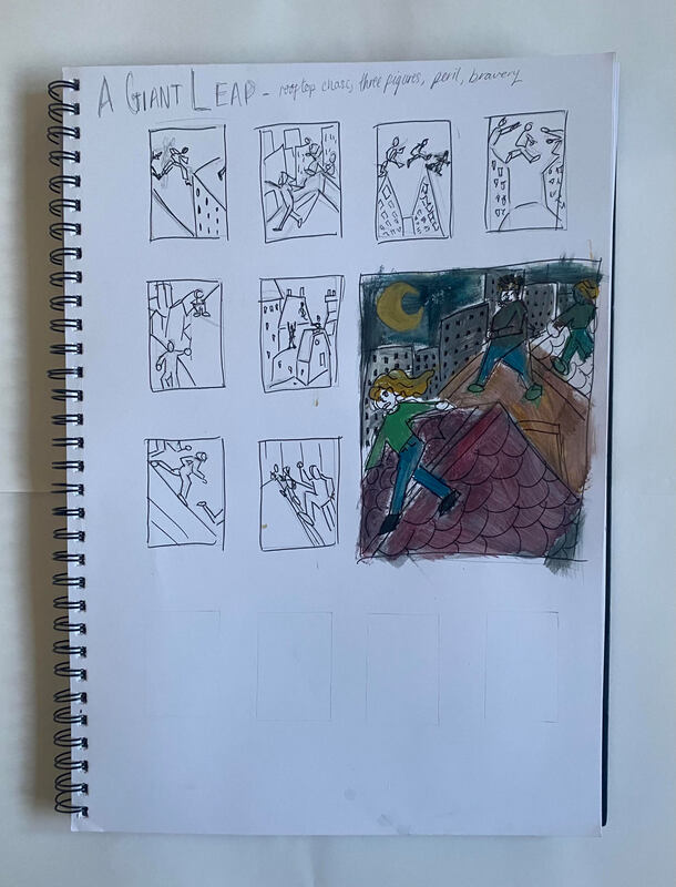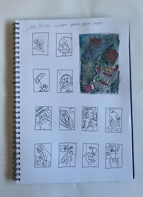 Since I tend to get caught up when creating thumbnails, I decided to make all of them very rough and loose, otherwise I would spend hours erasing figures to get proportions perfect, which isn't the point of first basic thumbnail sketches. To fix this, I allowed myself 30 minutes to sketch out the actual thumbnails, then 45 minutes to produce the client visual piece. While this means the client visual isn't as fully finished as I would usually like, it meant that I was more decisive and bold about my design choices. Looking back, I think this helped some pieces, and worsened others. Using such a quick paint job on "A Giant Leap" made the background look mucky and harder to see. This would obviously be changed in the final piece as I would be spending much longer on it, but something to note for future reference when creating client visuals, if I am giving myself such a short time frame to sketch and add colour, acrylic paint may not be the best idea on a small scale.