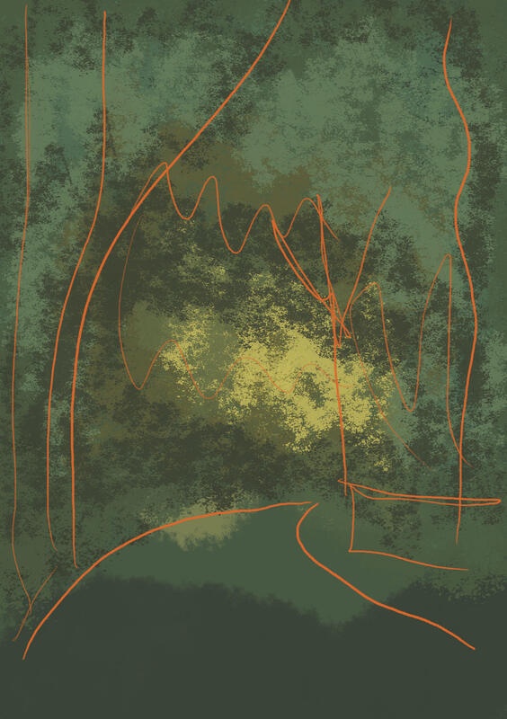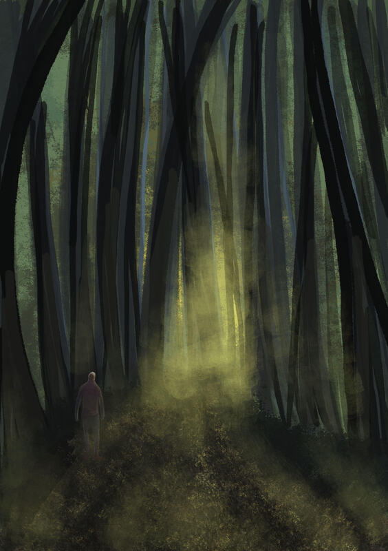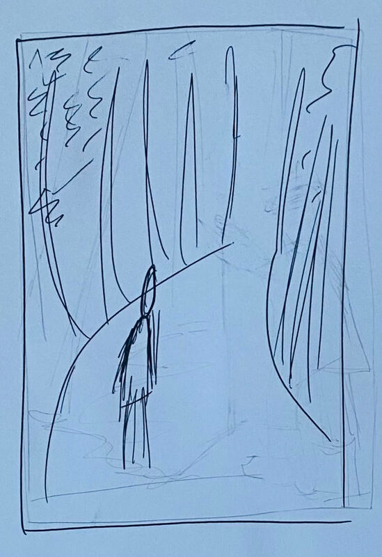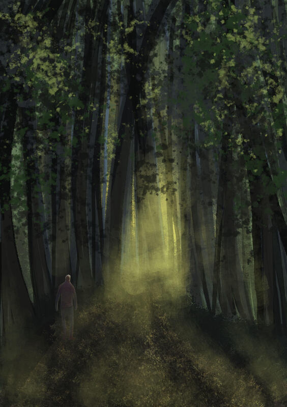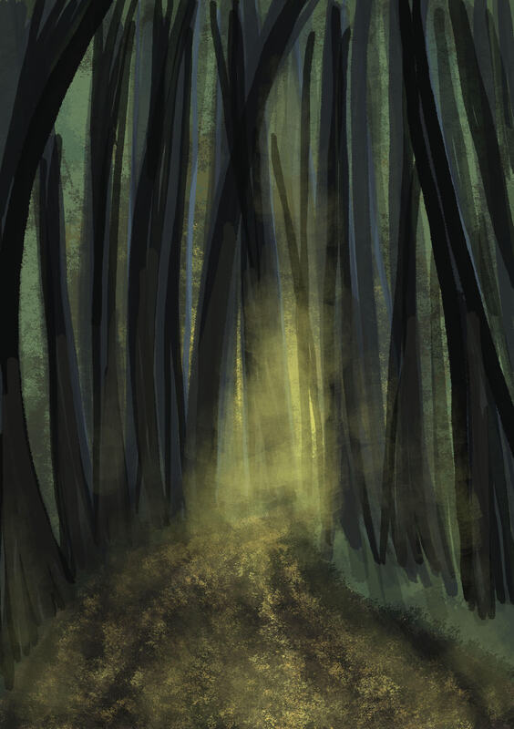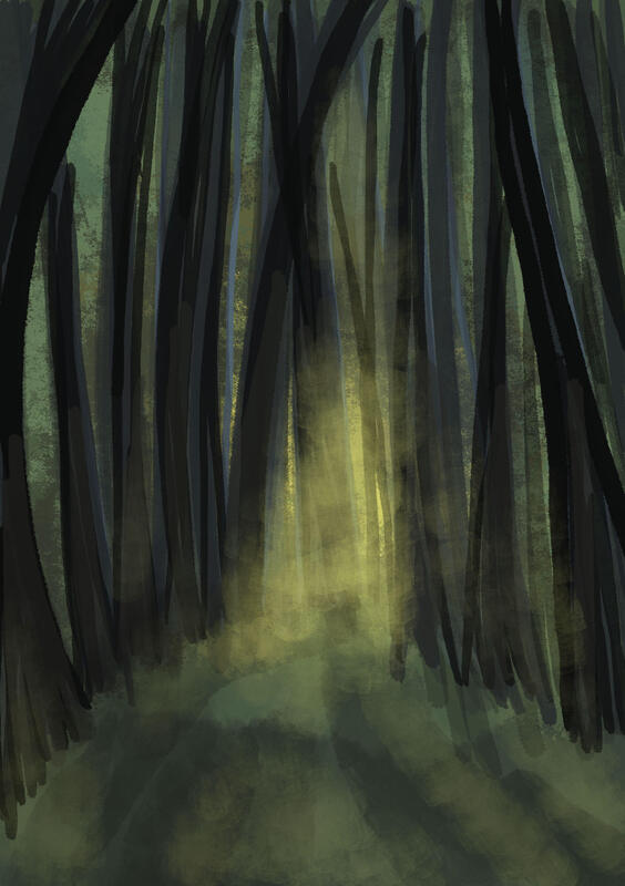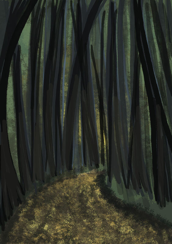 Before starting on my final piece, I wanted to be certain of where the shadowed figure was going to be placed within the frame. I quickly sketched out some possible placements, and thought he fit best on the left, following the curve of the trees. I knew I wanted him to be moving away from the viewer, having his face obscured adding another sense of mystery to the piece, being unable to know whether the figure is trustworthy or not. I also wanted him facing this way to be moving towards the weird yellow light in the background. I wanted this yellow eerie light to bleed through the trees almost like a mist, and have the figure be on his way to enter it.
