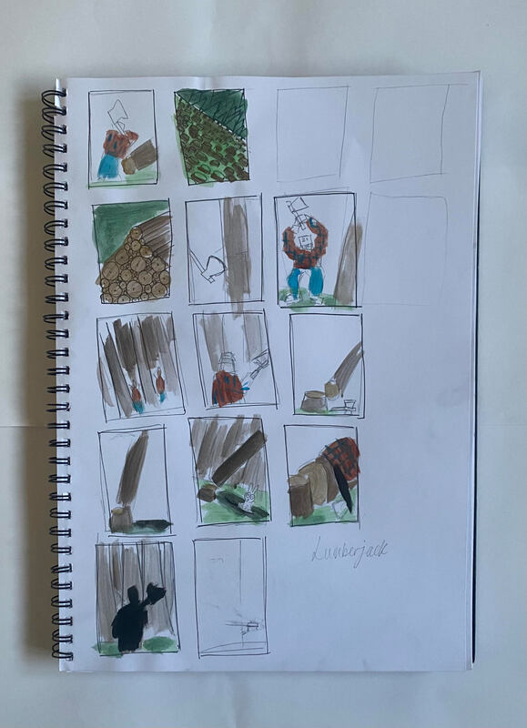 Due to my previous struggles with creating thumbnails, I decided to leave all of my initial thumbnails very rough and loose in shape/style. This meant I got to work sketching out placements and differing layouts, rather than spending 30 minutes sketching out one "perfect" character. Getting rid of this idea that each thumbnail needs to be perfect really helped, I discovered this in my first studio session on this project, when creating super quick thumbnails for the prompt "LUMBERJACK". Whilst none of the thumbnails are anything incredible, the full page took me just over 30 minutes, and allowed me to get my ideas down super quick.